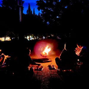 お店の前で焚火を囲んで
