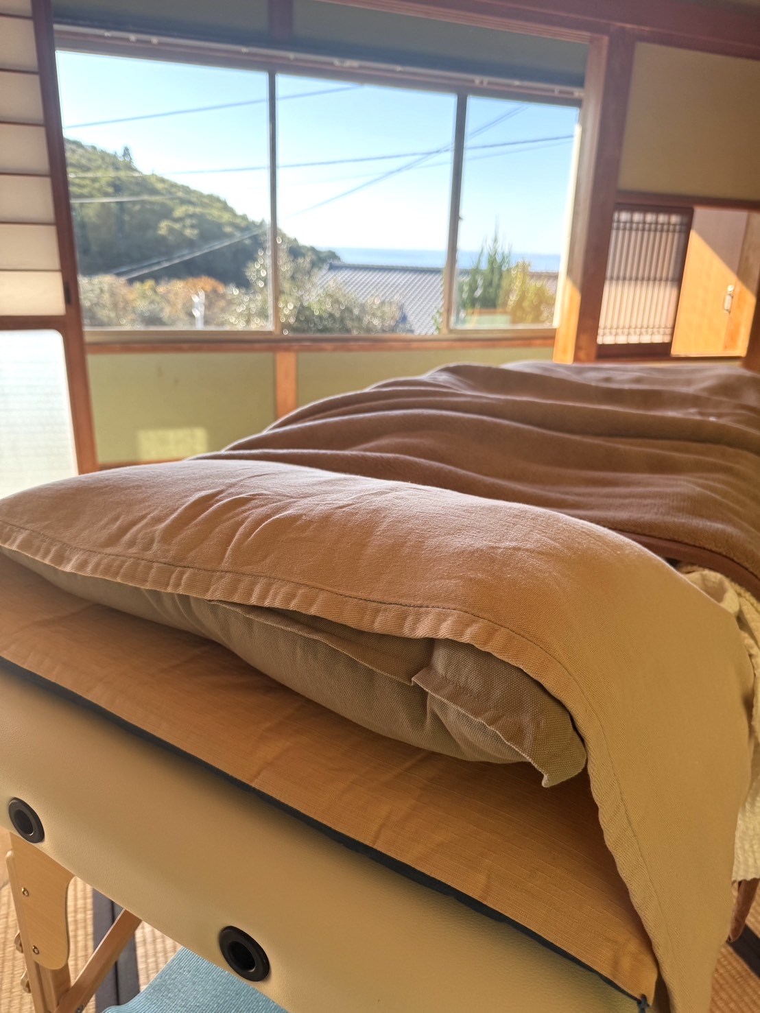 窓から海と山が見える