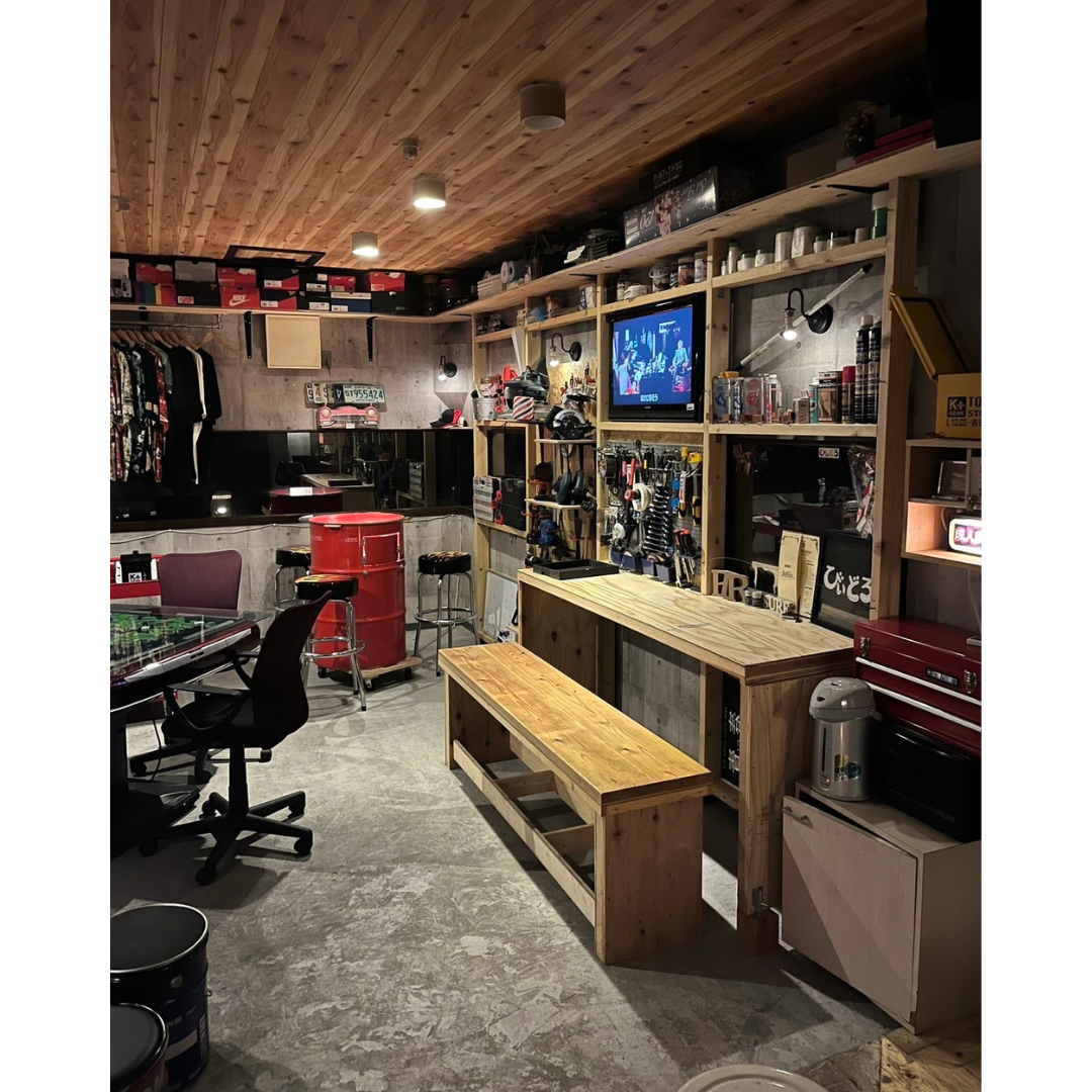 ガレージのような空間は全て手作り🪚🪵