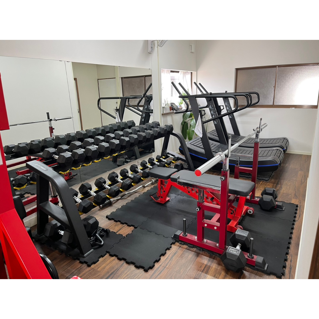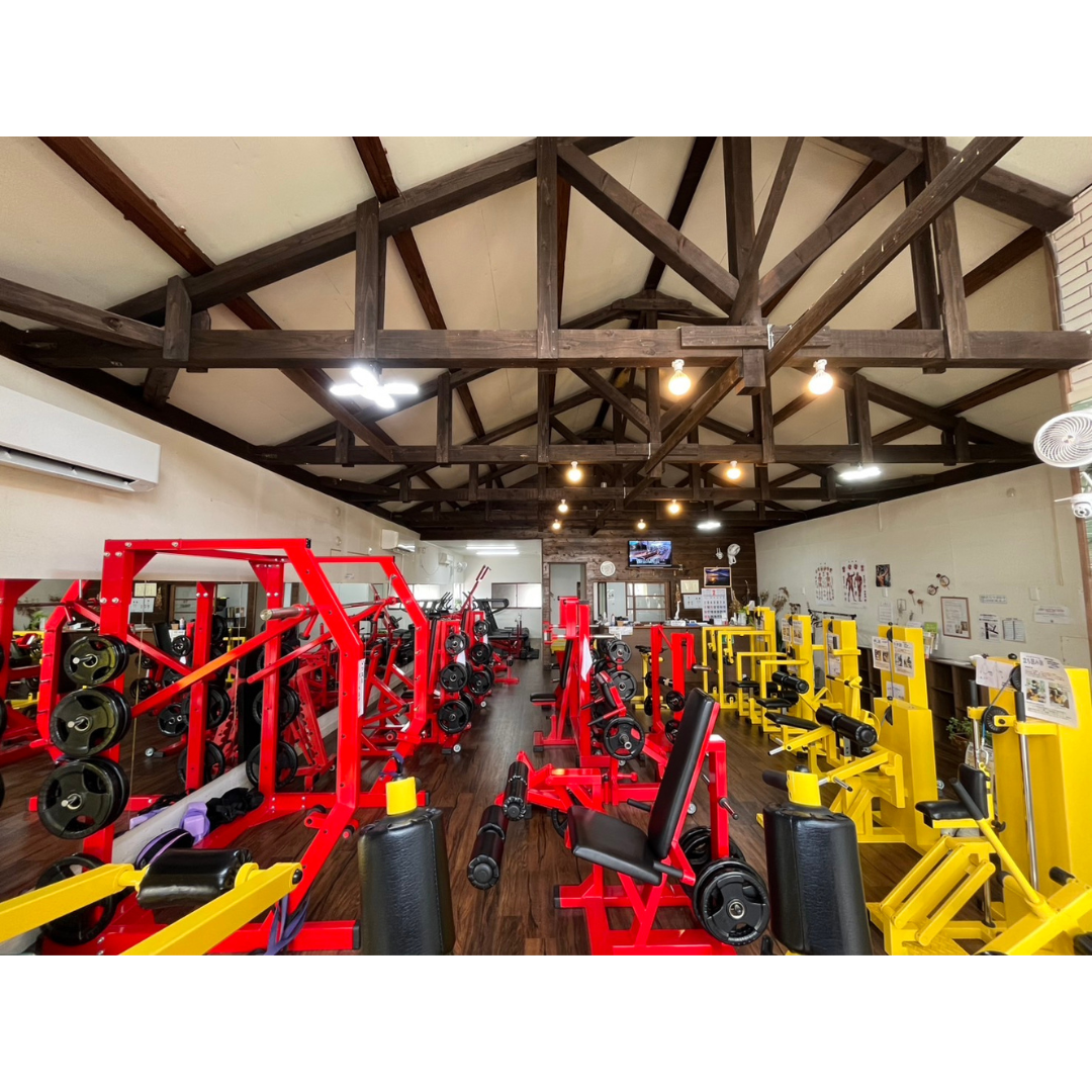 | 客席 | トレーニングマシン26台 ベンチプレス1台 ダンベル2.5㎏~35㎏完備 自走式トレッドミル2台 更衣室有り |