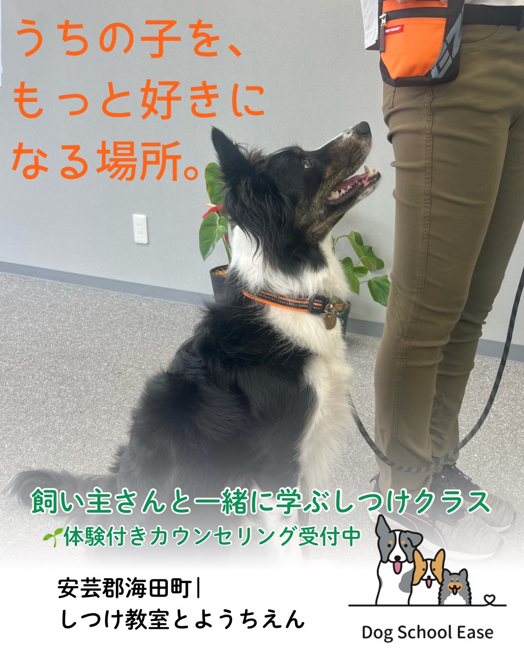 「Dog School Ease」は、人も犬も心地よく学び、共に成長できる場所です。