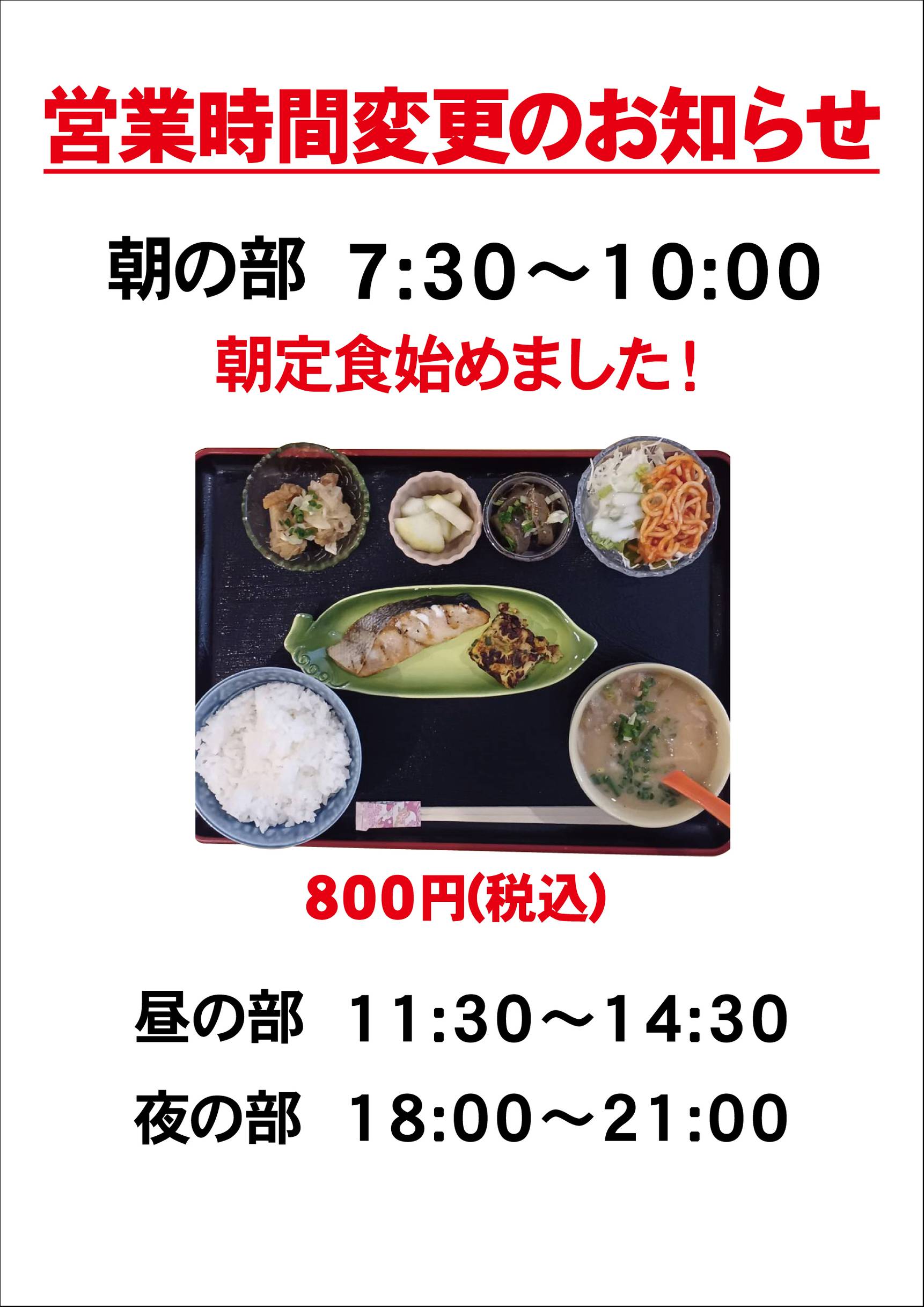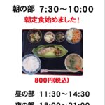 | 営業時間 | 朝の部 7:30~10:00 昼の部 11:30~14:30 夜の部 18:00~21:00 |