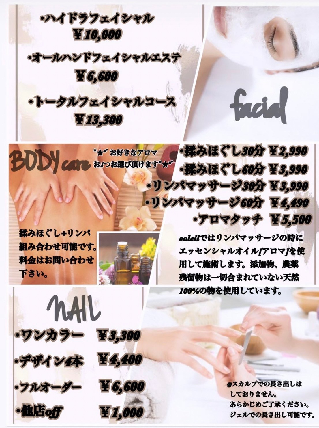 | 定休日 | 日曜日(祝日はフェイシャルとネイルのみご対応可) |